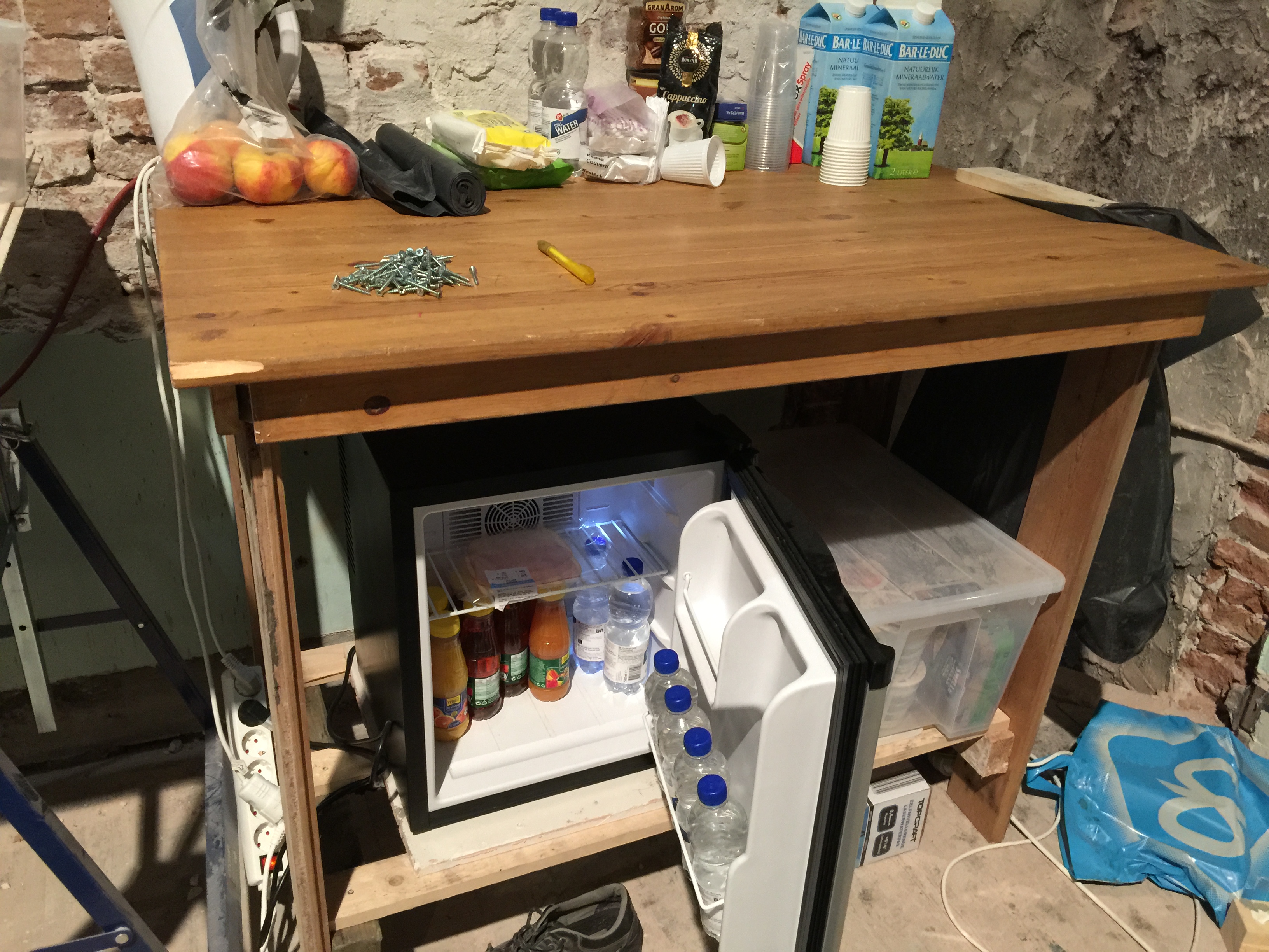 Een koelkastje voor lekker koude drankjes en extra tijdelijk tafeltje van gevonden hout. En natuurlijk de 2 harde werkers die hun vrije tijd opofferen voor ons huisje. Super blij daarmee!!!!!!