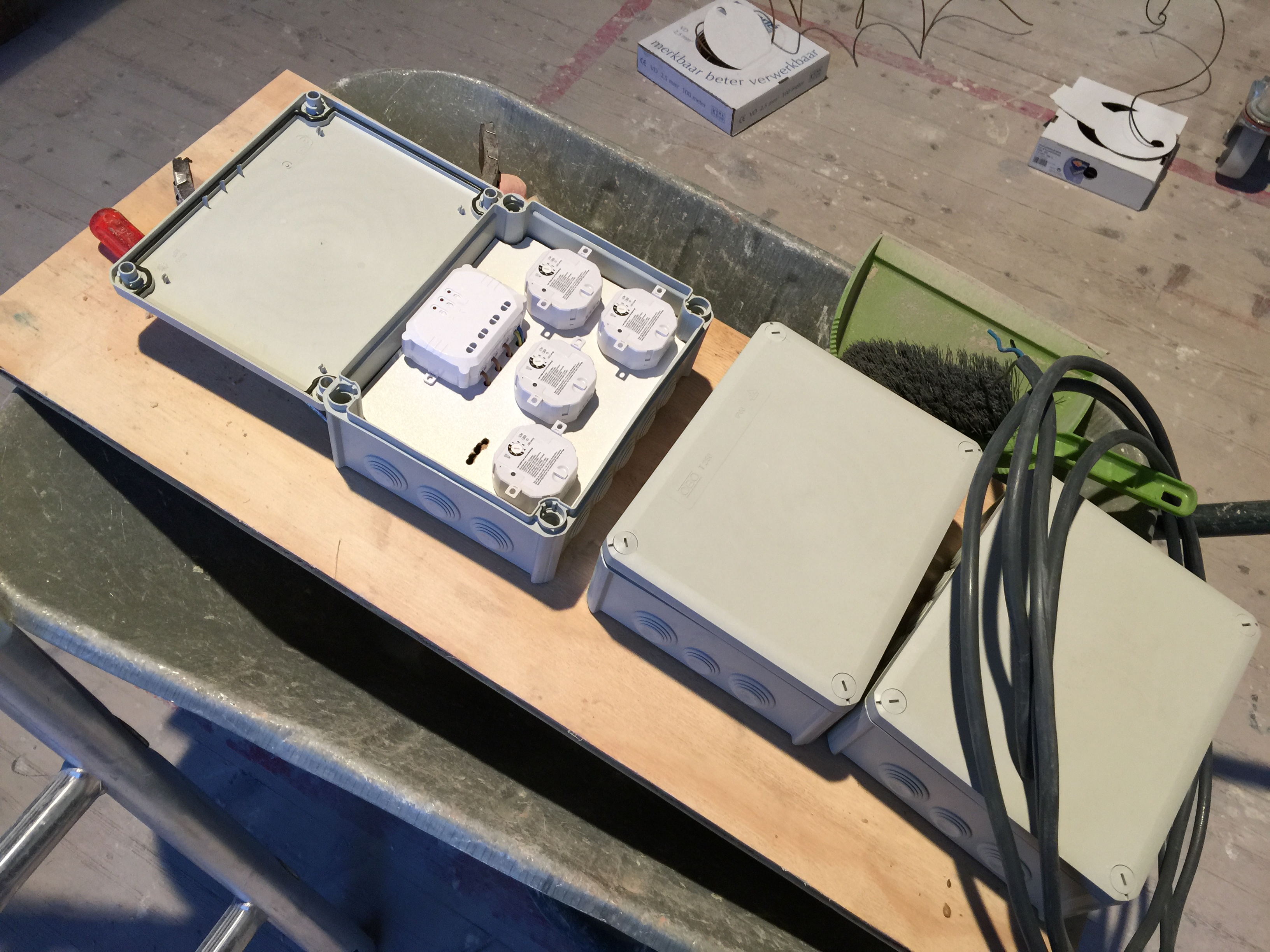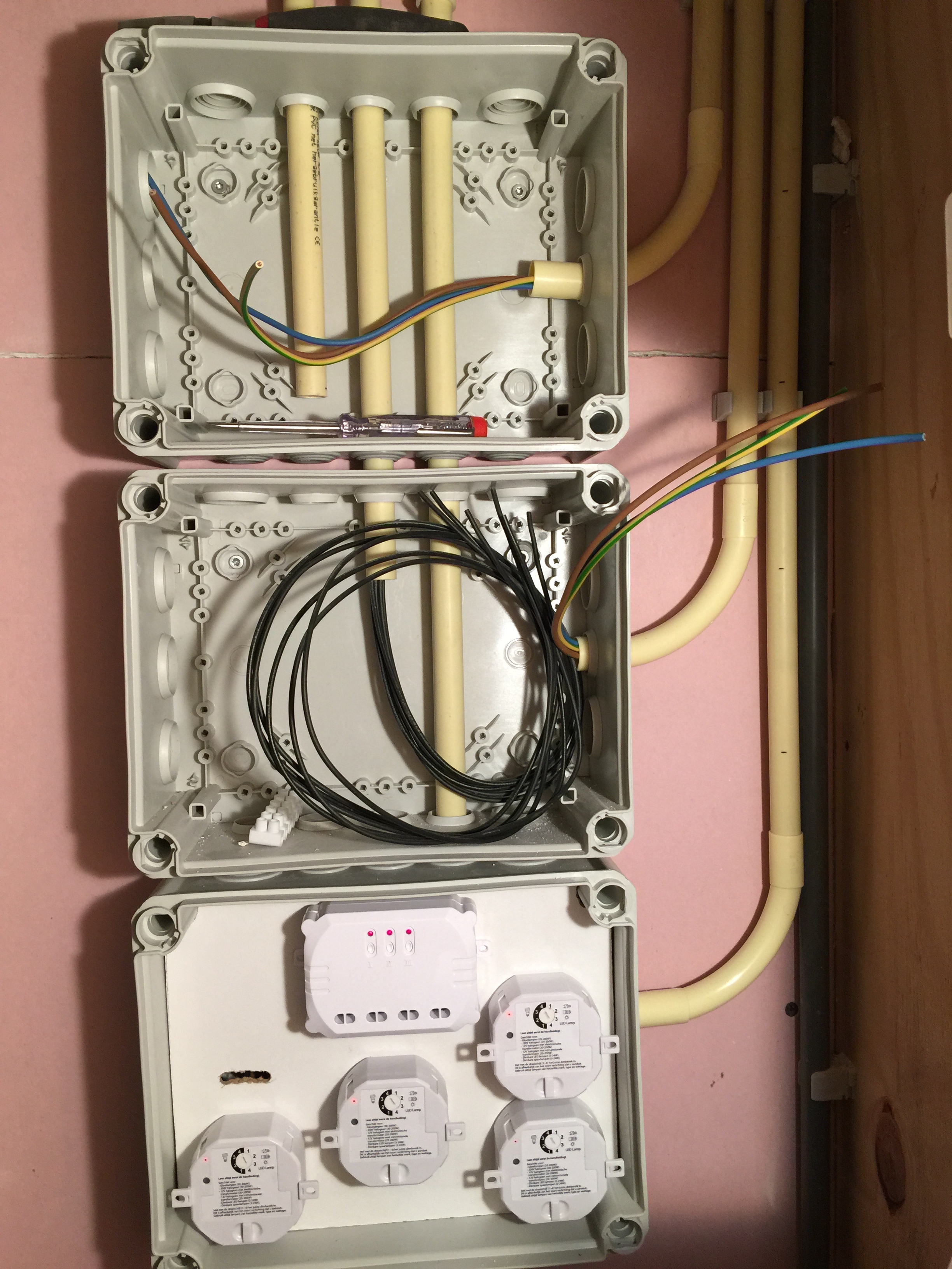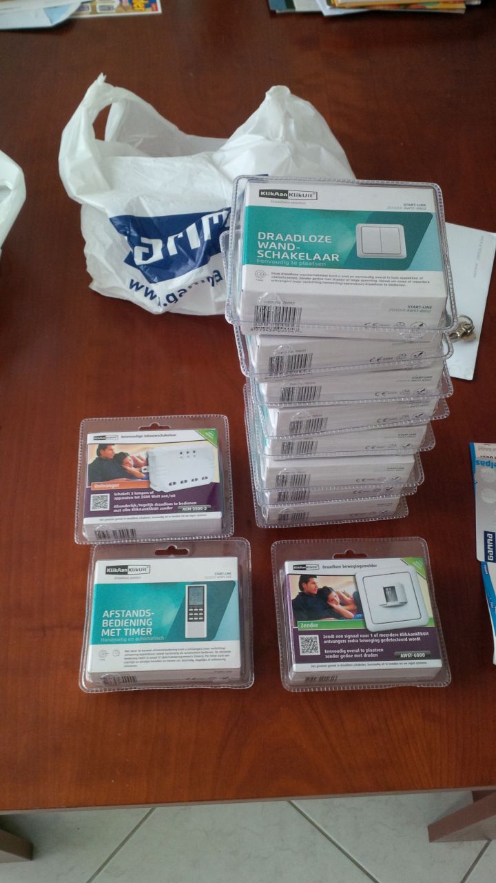Bij de Gamma was er een tijdelijke aanbieding van of 20% korting op 1 artikel of 30% korting op KAKU, dus ik heb meteen mijn slag geslagen. Alles bij elkaar is nog steeds een klein vermogen, maar losse dimmers zijn ook niet goedkoop. Normaal gesproken bouw je zo’n dimmer of schakelaar in je plafond, maar als er dan iets is kan je er nooit meer bij. Dus het idee was om alles in dozen in de meterkast te doen. Kan hier nog heel veel over typen, maar hier zal nog wel een keer een heel artikel over verschijnen. Voorlopig zijn we nog lang niet klaar met dit systeem, maar we zijn goed op weg!