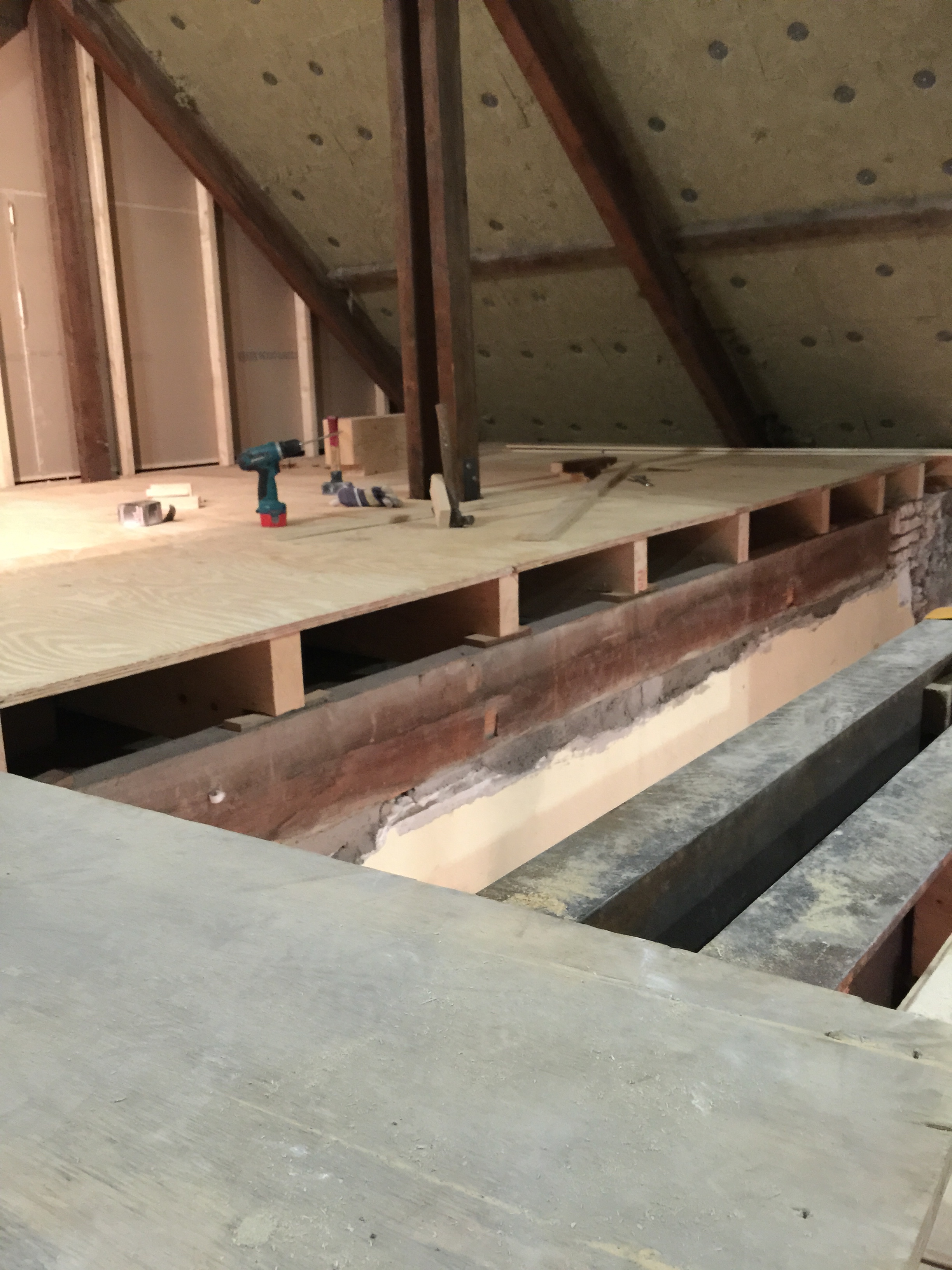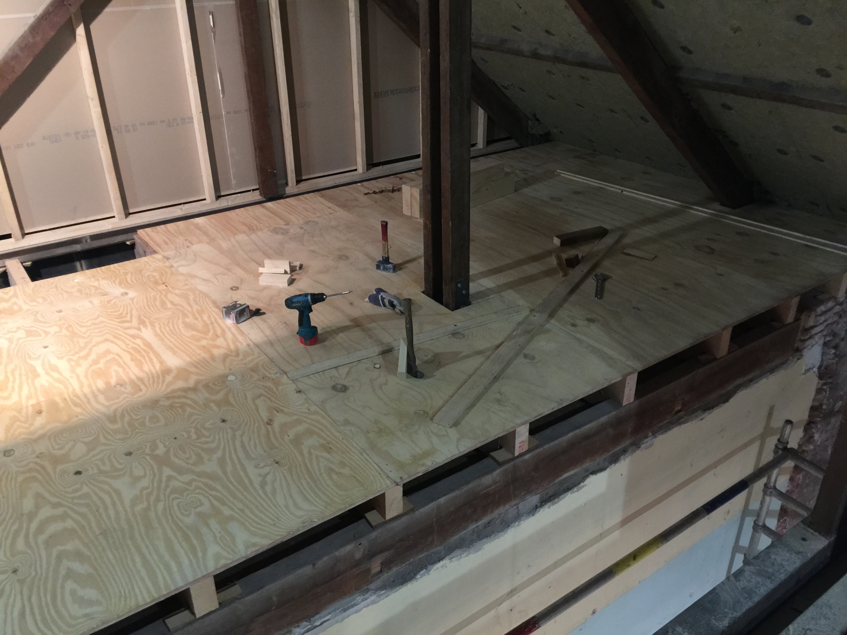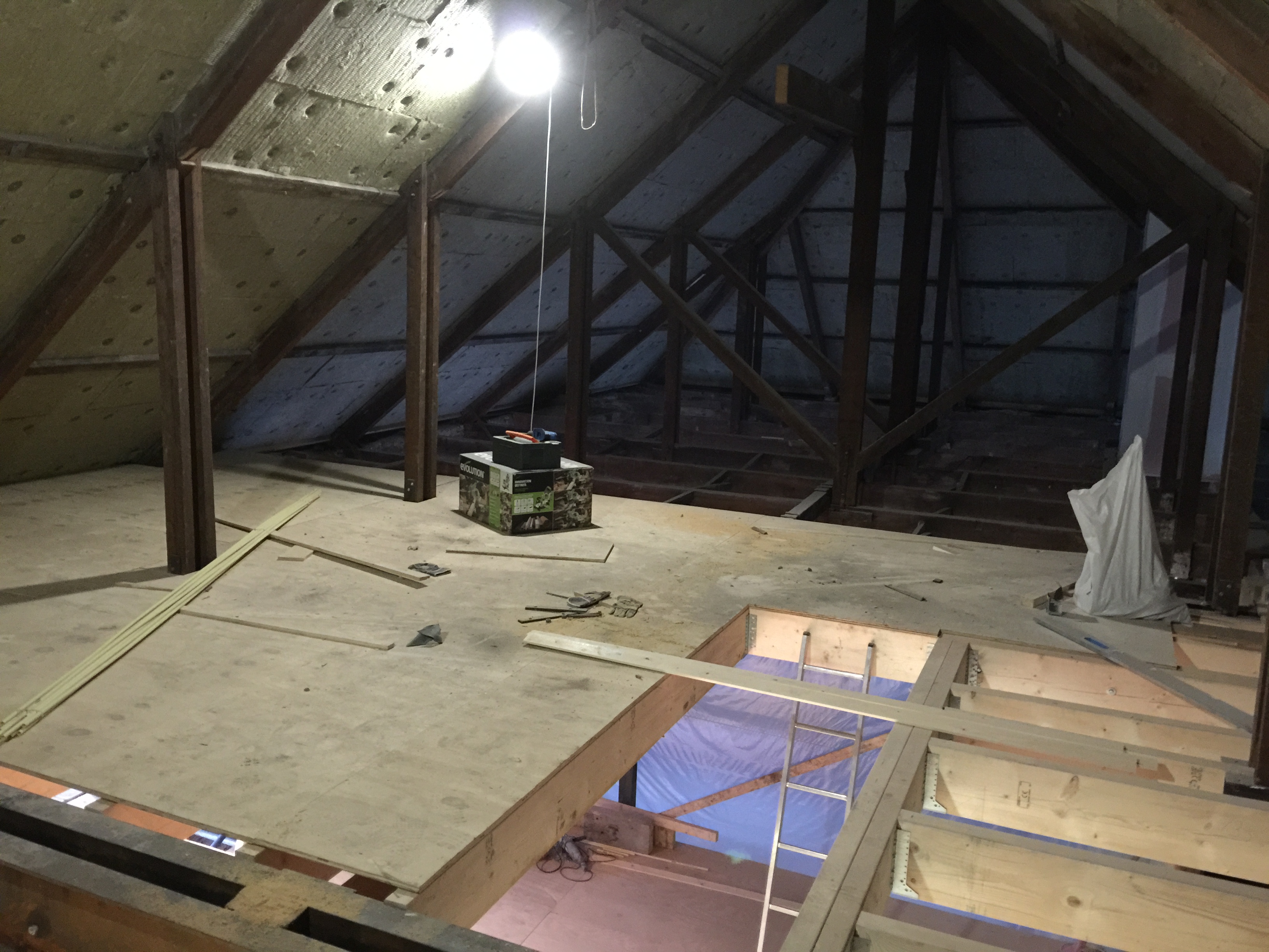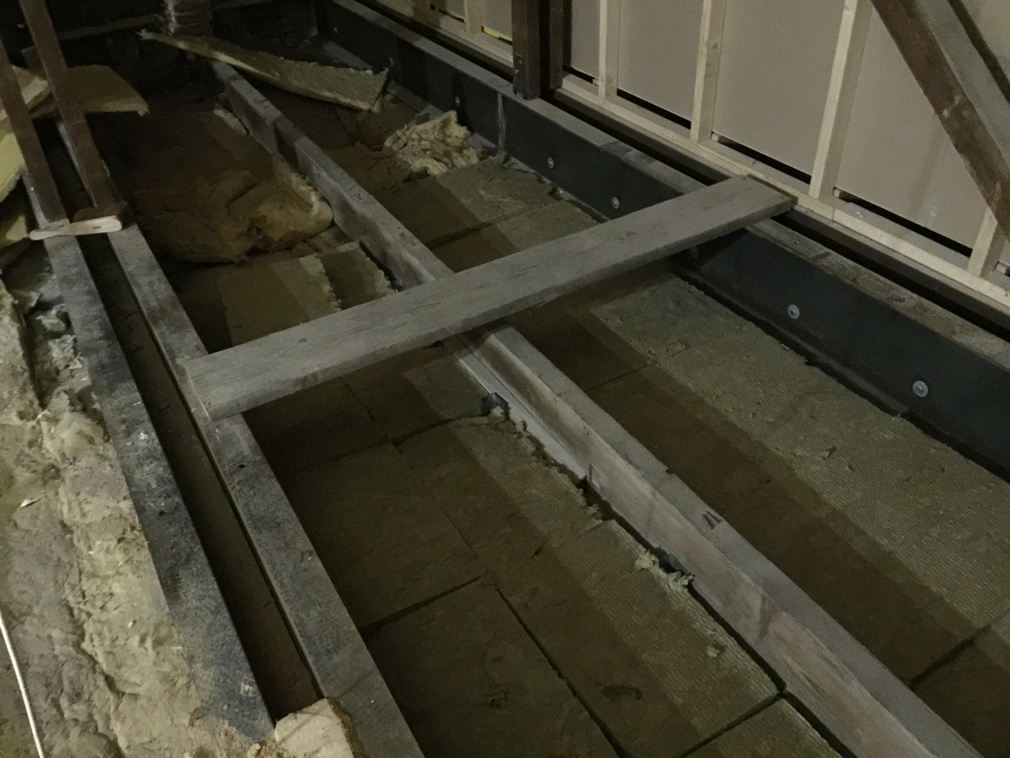De laatste foto’s die je nu te zien krijgt zijn de laatste ontwikkelingen as we speak, de zolder. Dit is echt een rotklus omdat het 1. Opmeten, 2 Zagen, 3 Waterpas maken, 4. Vastzetten, 5 Waterpas, 6 Aanpassen en REPEAT. Dit kost zoveel tijd! In dit geval ook omdat we er niet van onderen erbij kunnen, dus alles moet van boven de balken. De eerste foto is van het “makkelijke gedeelte”, waarbij recentelijk de houten andreaskruisen zijn verwijderd, waardoor er een grote ruime ruimte ontstaat. Boven de gezamenlijke trappenhuis waarboven ik nog een stuk zolder heb, heb ik extra geïsoleerd met steenwol met als gevolg dat ik op het moment van schrijven en al 2 dagen niet normaal veel last heb van jeuk op mijn armen. Ging helaas niet weg bij douchen waar ik eigenlijk van uit ging, iemand tips?