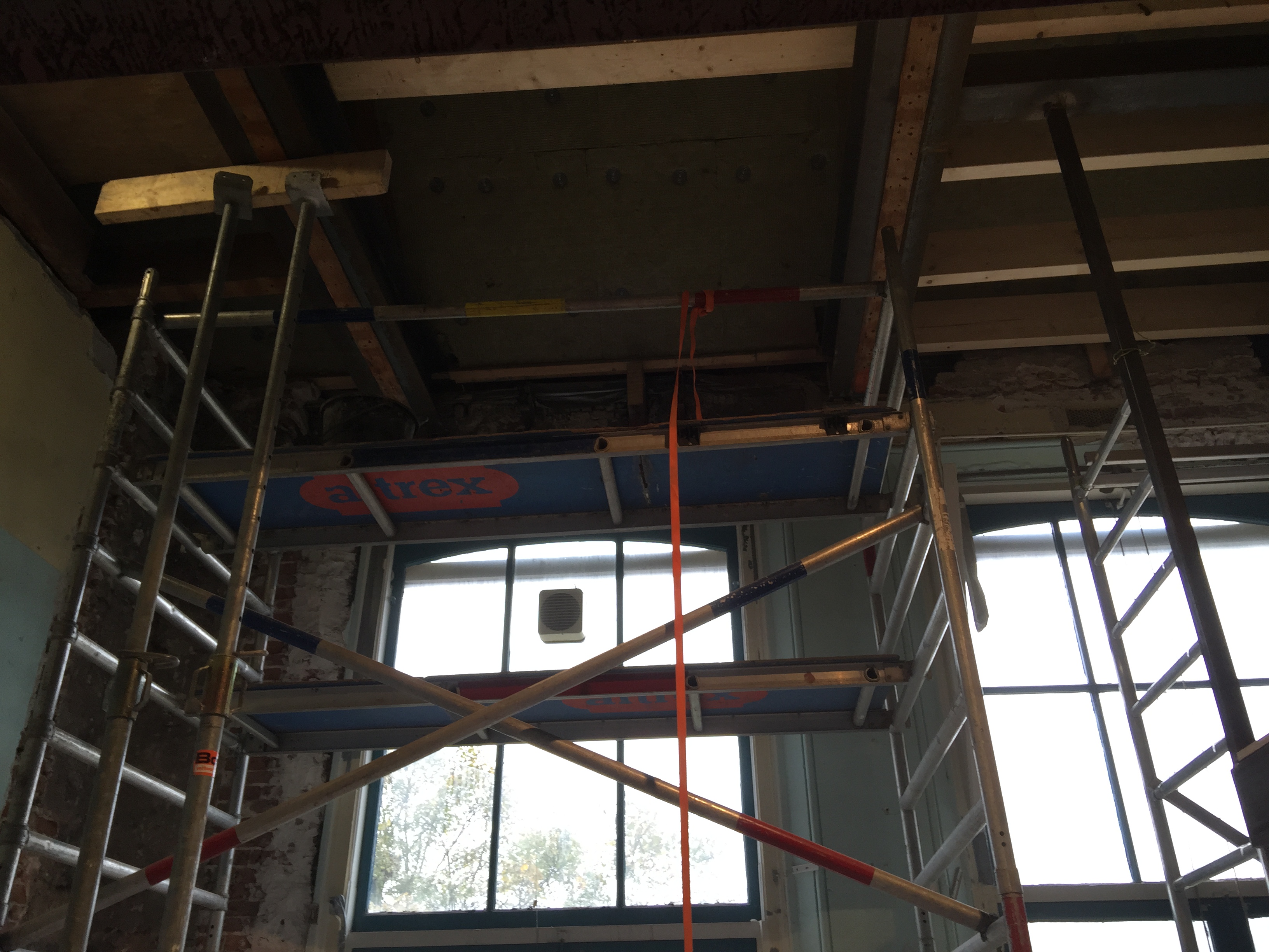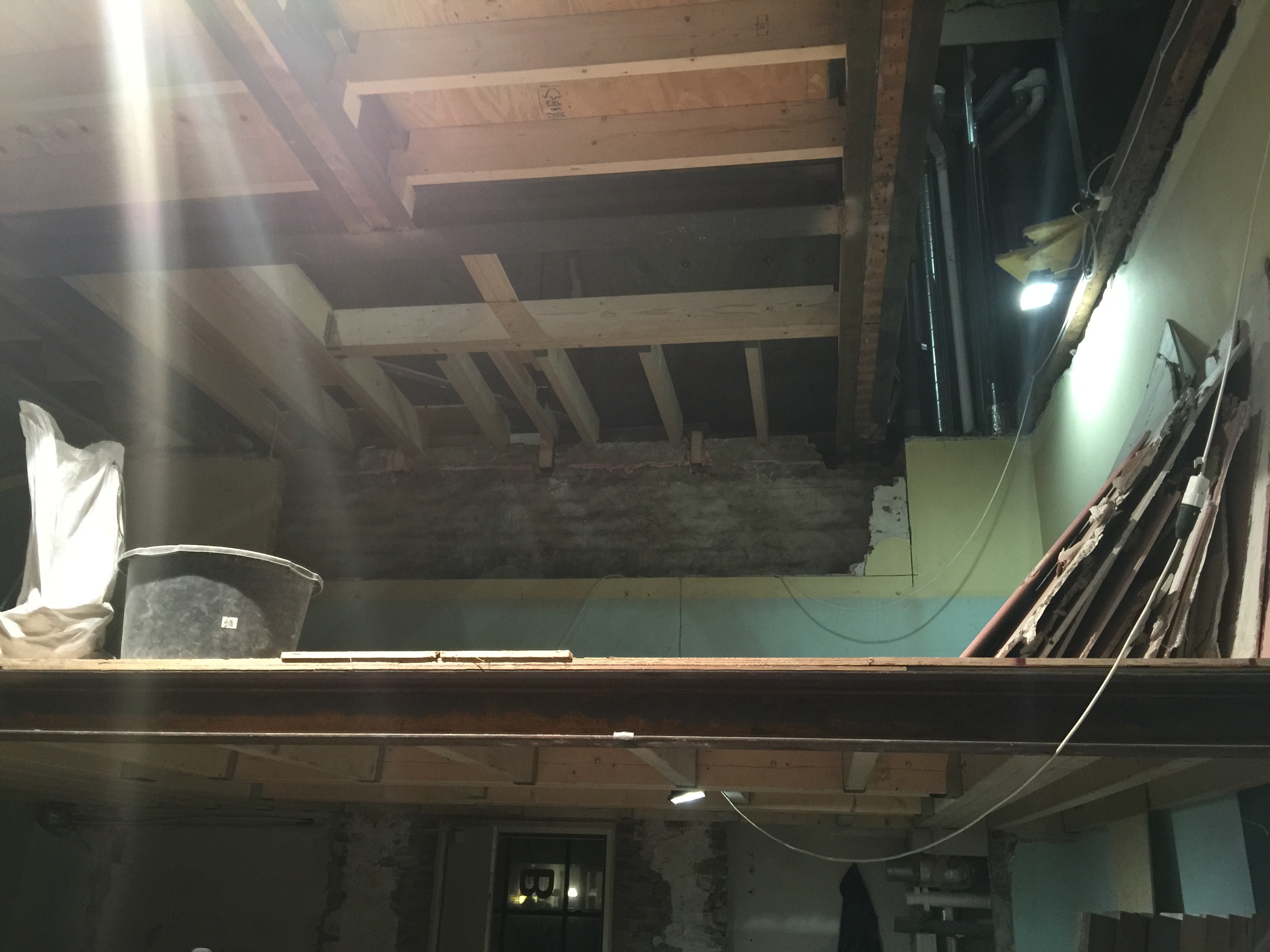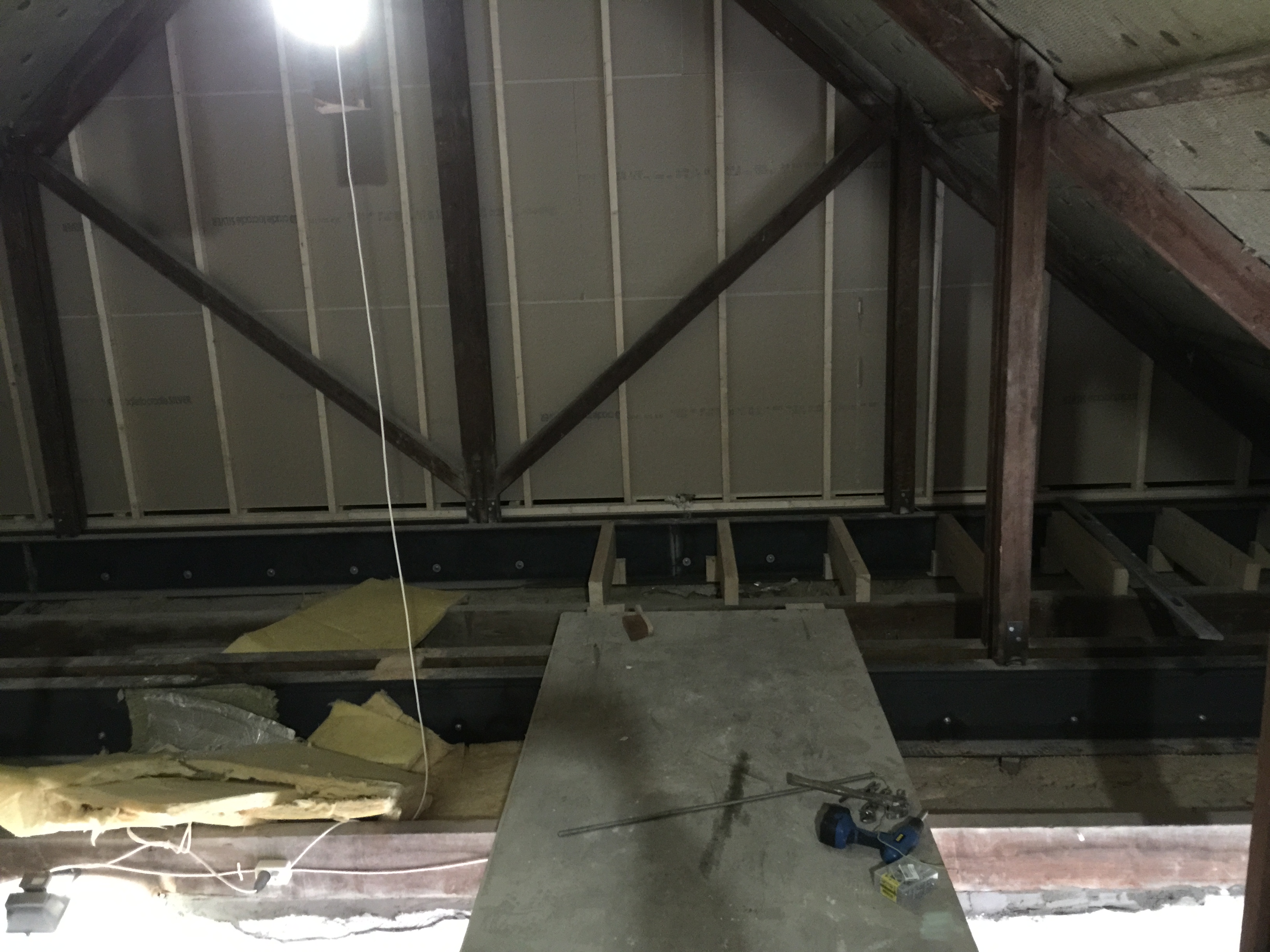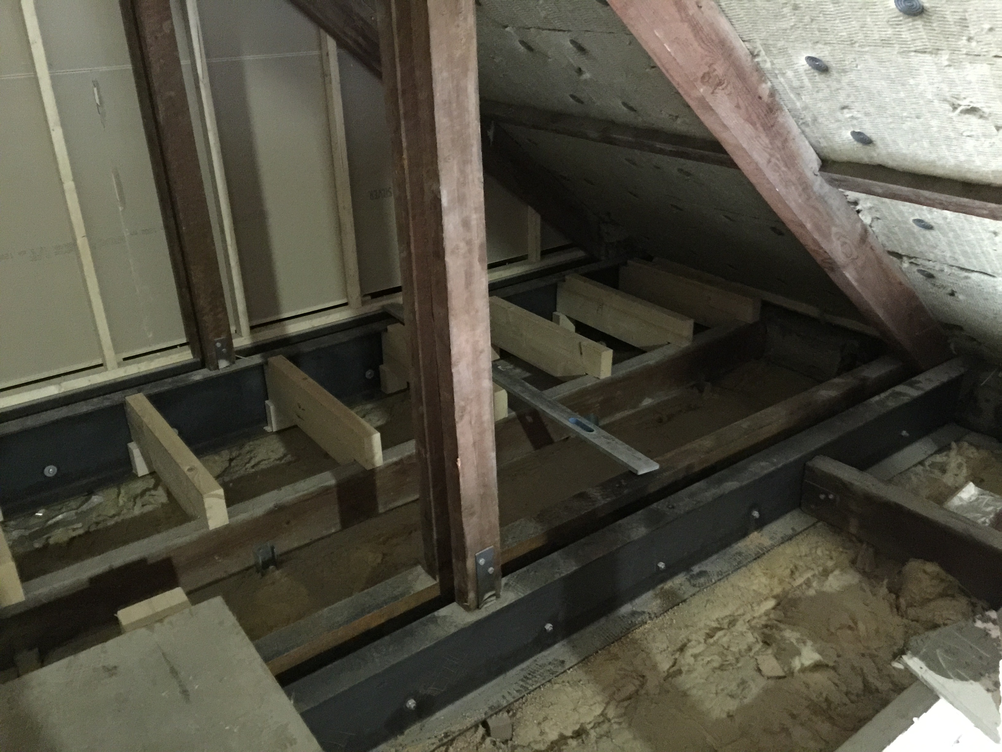 De laatste foto’s die je nu te zien krijgt zijn de laatste ontwikkelingen as we speak, de zolder. Dit is echt een rotklus omdat het 1. Opmeten, 2 Zagen, 3 Waterpas maken, 4. Vastzetten, 5 Waterpas, 6 Aanpassen en REPEAT. Dit kost zoveel tijd! In dit geval ook omdat we er niet van onderen erbij kunnen, dus alles moet van boven de balken. De eerste foto is van het “makkelijke gedeelte”, waarbij recentelijk de houten andreaskruisen zijn verwijderd, waardoor er een grote ruime ruimte ontstaat. Boven de gezamenlijke trappenhuis waarboven ik nog een stuk zolder heb, heb ik extra geïsoleerd met steenwol met als gevolg dat ik op het moment van schrijven en al 2 dagen niet normaal veel last heb van jeuk op mijn armen. Ging helaas niet weg bij douchen waar ik eigenlijk van uit ging, iemand tips?