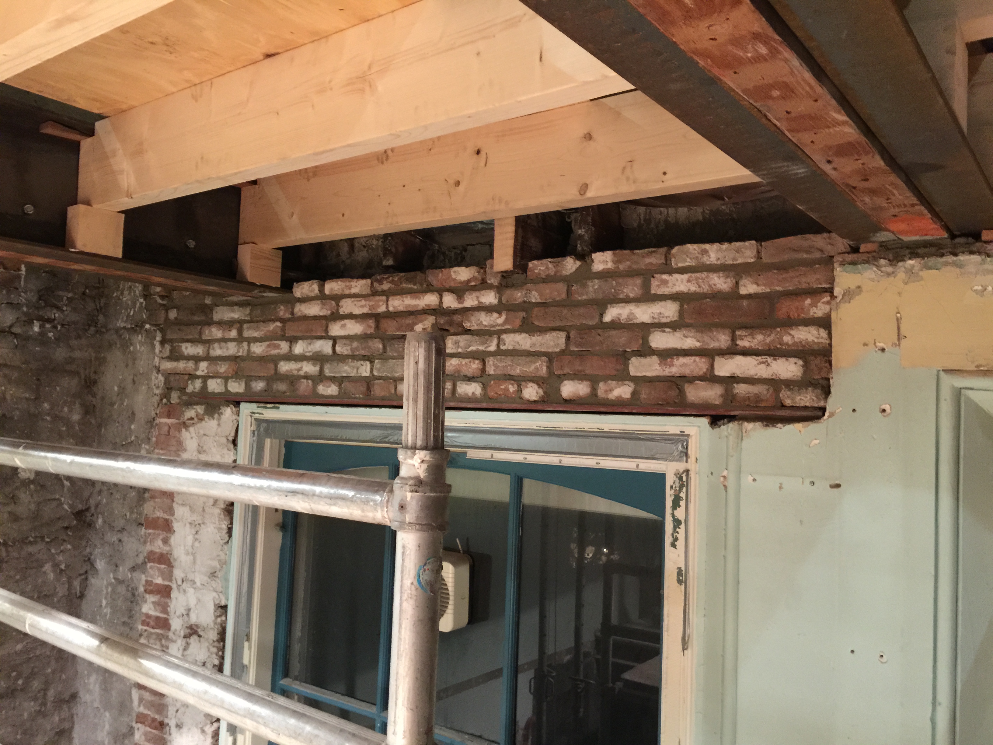 Zoals te zien op bovenstaande foto’s hebben we de oude bakstenen onder de stalen balk moeten verwijderen en hier een stalen hoekligger moeten plaatsen om de zware druk van de balk te verdelen over een grotere oppervlakte. En dit daarna weer moeten opmetselen met de oude bakstenen. Zodat er weer een mooi geheel ontstaat. Op de laatste foto is diezelfde balk die problemen bij het kozijn gaf aan de andere kant verlengd. Zodat wij een muurtje weg konden halen voor de kast, zoals hieronder te zien:
