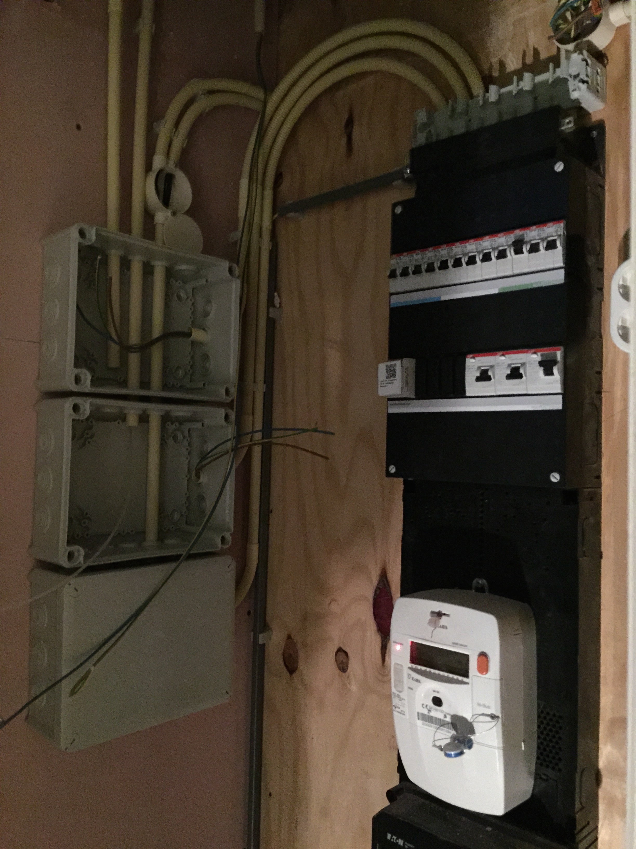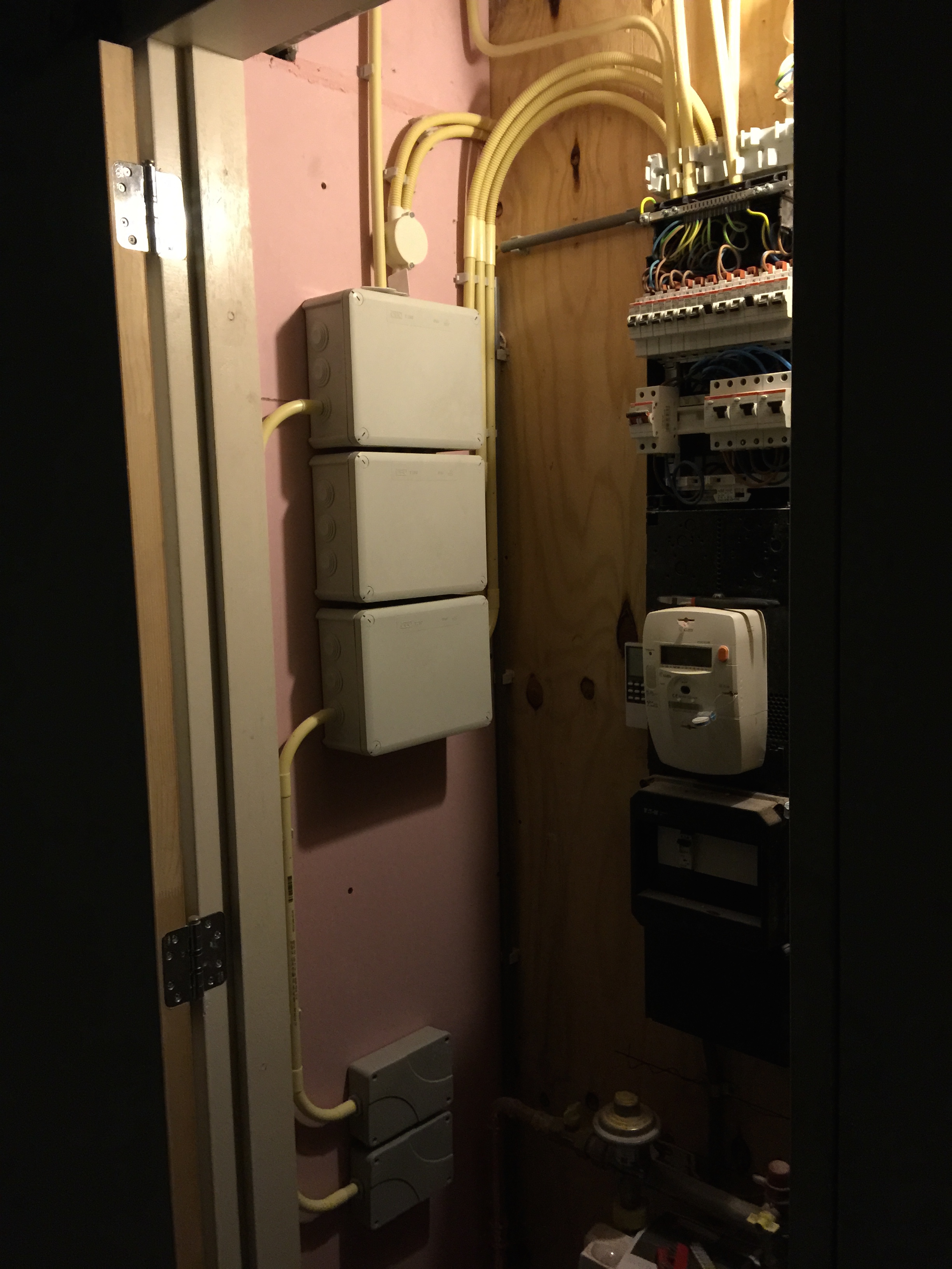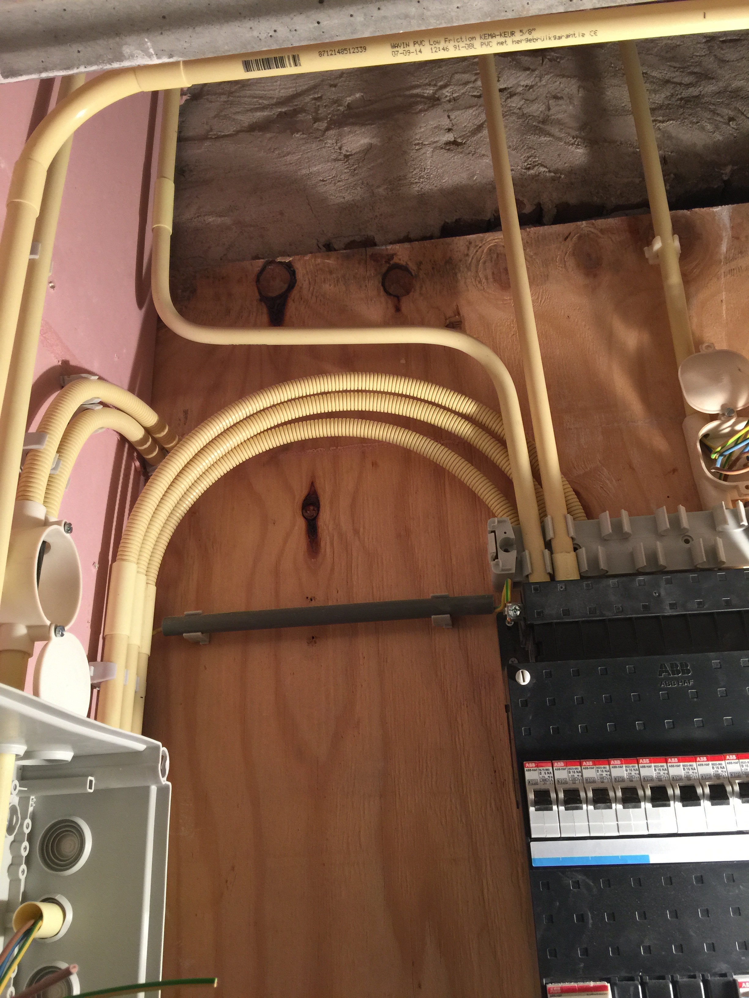 Tijdens al deze werkzaamheden was de elektricien (lees: mijn broer Eddie) hard bezig met de bedrading van de domotica, brandmelders, ingebouwde speakers en lampen. Ik ga gebruik maken van het Klik-aan-klik-uit systeem, nu zal je waarschijnlijk denken: ‘Dat is zo’n setje van de Gamma met 3 ontvangers en 1 afstandsbediening.’ Ja dat hebben ze ook, maar ik ga gebruik maken van inbouw met een kaku( Klik Aan Klik Uit ) server waardoor je met je iphone/ipad je hele huis kan bedienen (dimmen/scenes/gordijnen etc). Zie onderstaande foto’s van waar Eddie nu mee bezig is: