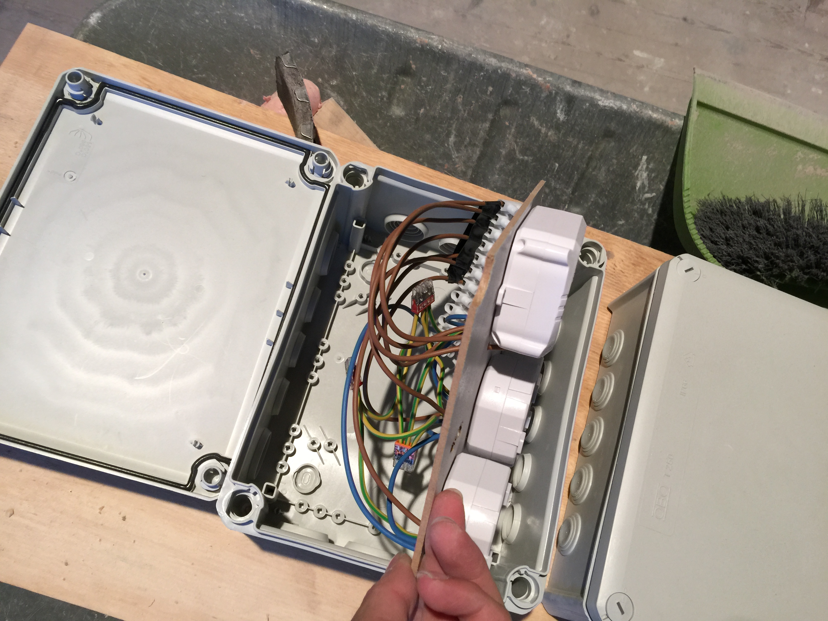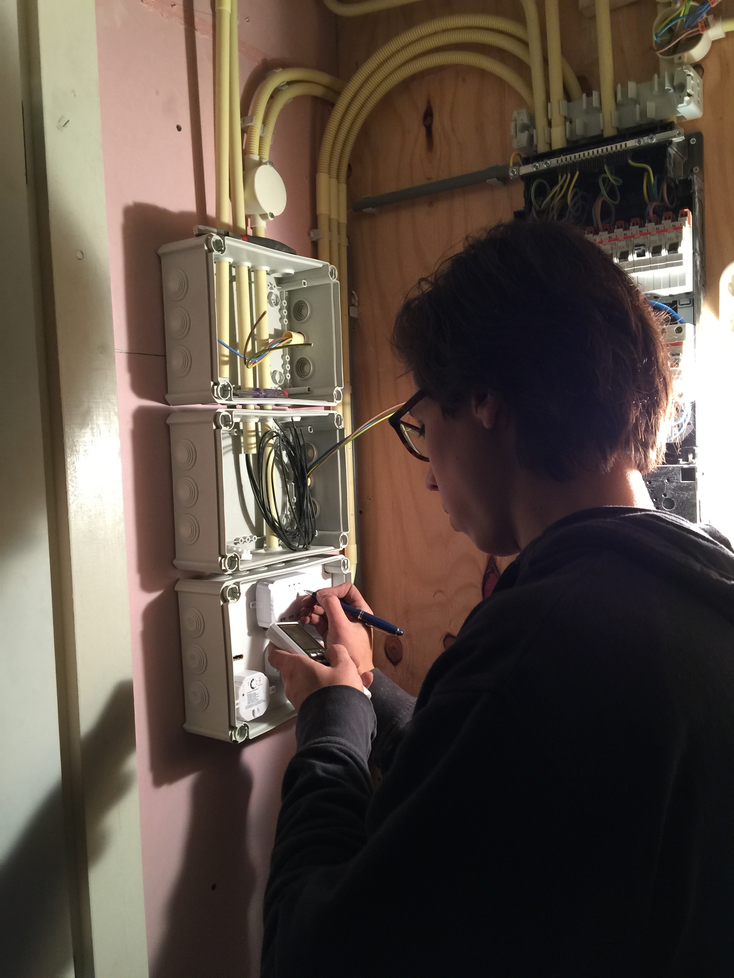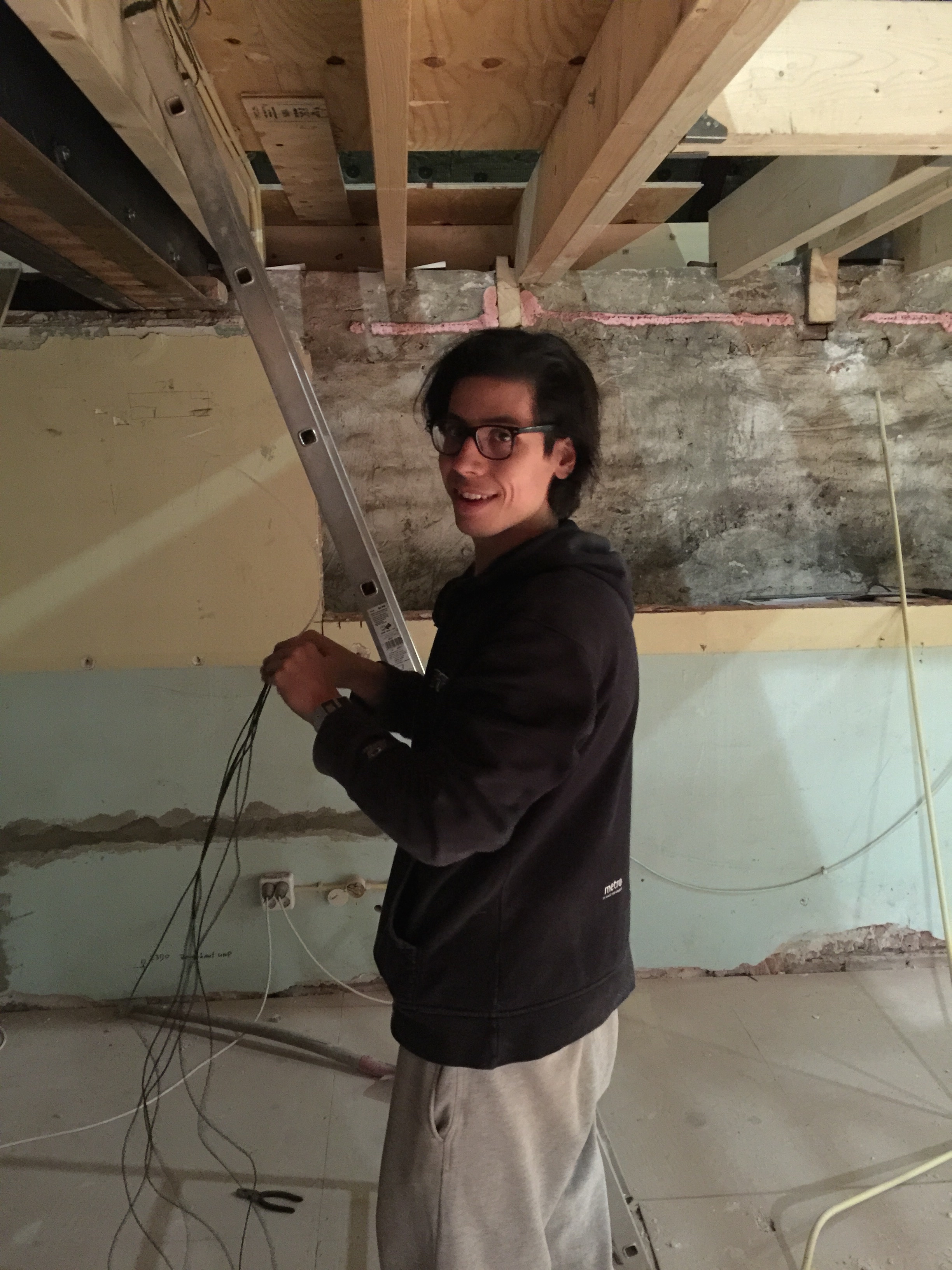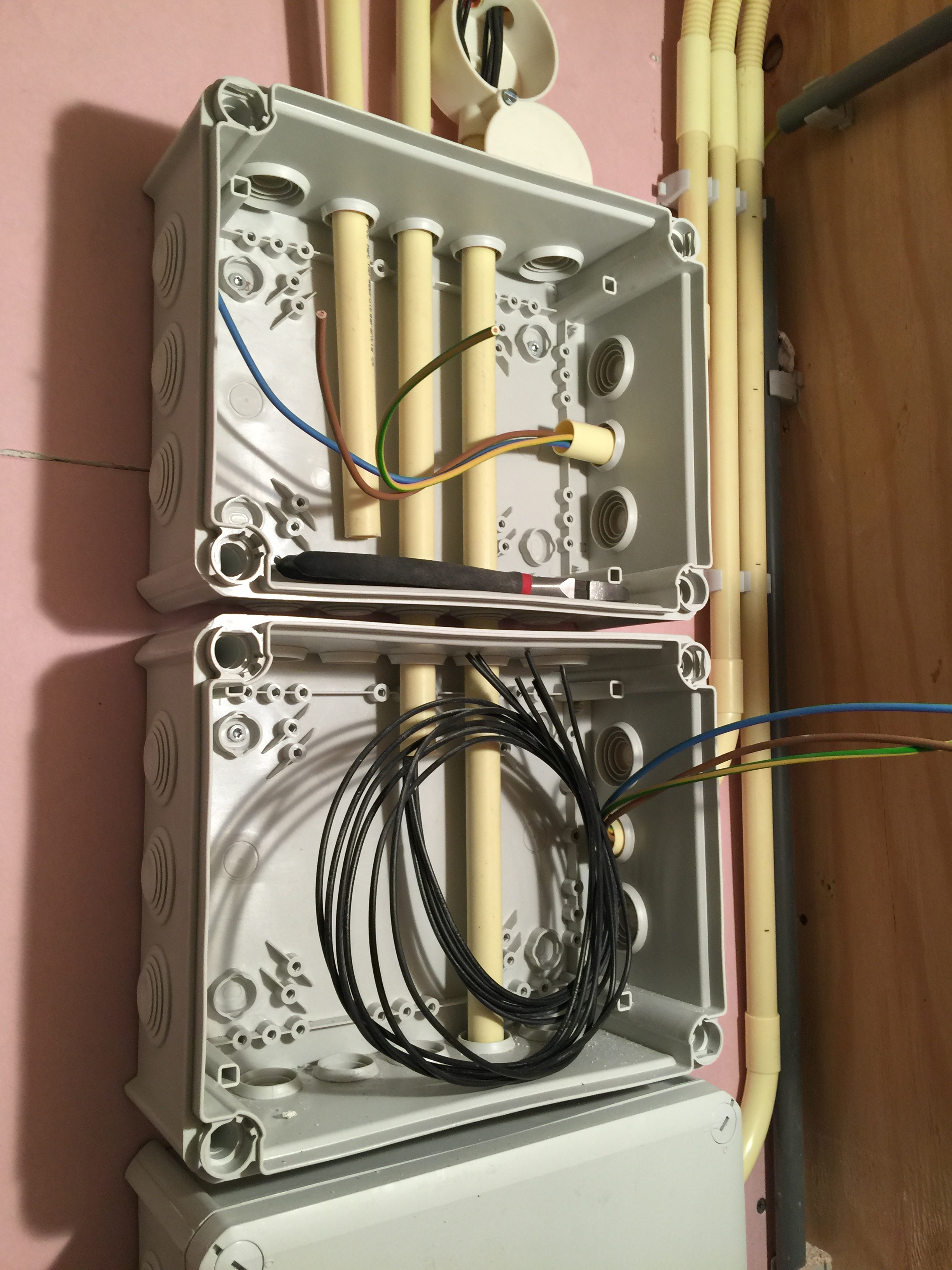 Tijdens al deze werkzaamheden was de elektricien (lees: mijn broer Eddie) hard bezig met de bedrading van de domotica, brandmelders, ingebouwde speakers en lampen. Ik ga gebruik maken van het Klik-aan-klik-uit systeem, nu zal je waarschijnlijk denken: ‘Dat is zo’n setje van de Gamma met 3 ontvangers en 1 afstandsbediening.’ Ja dat hebben ze ook, maar ik ga gebruik maken van inbouw met een kaku( Klik Aan Klik Uit ) server waardoor je met je iphone/ipad je hele huis kan bedienen (dimmen/scenes/gordijnen etc). Zie onderstaande foto’s van waar Eddie nu mee bezig is: