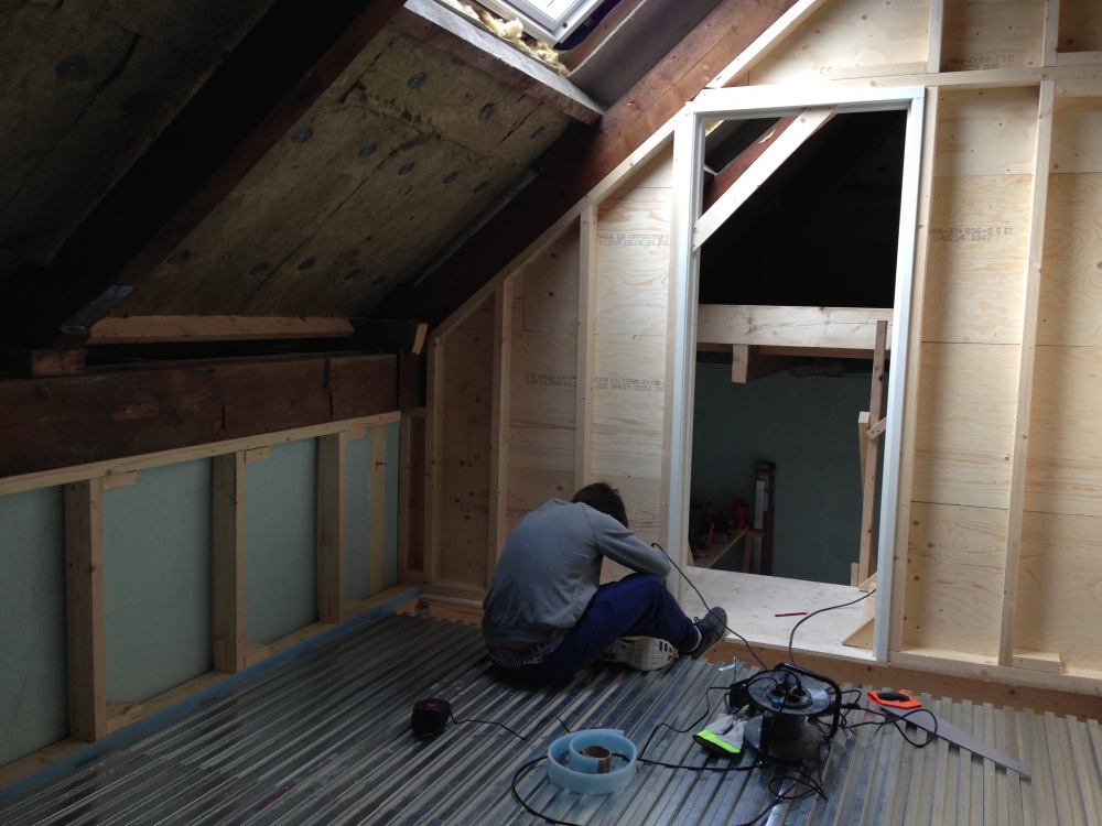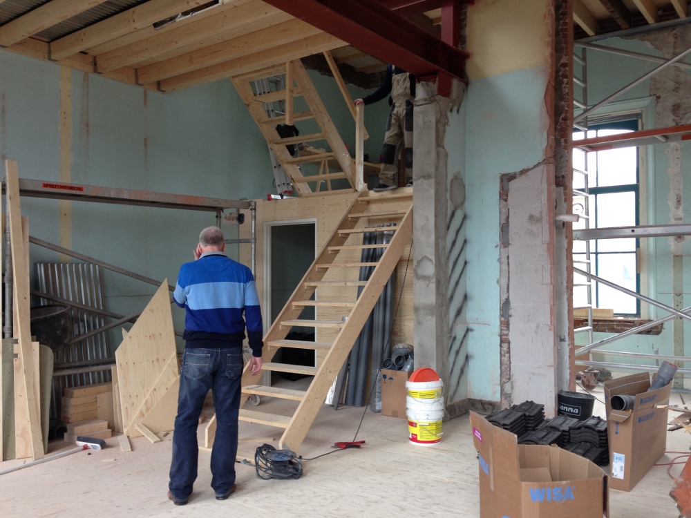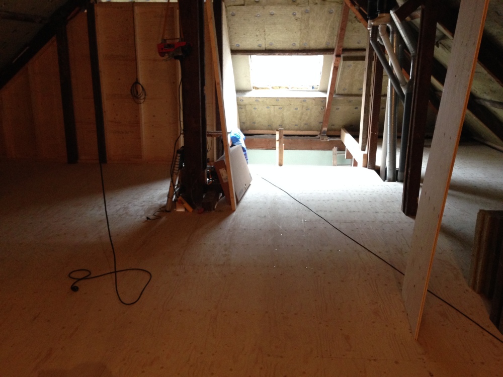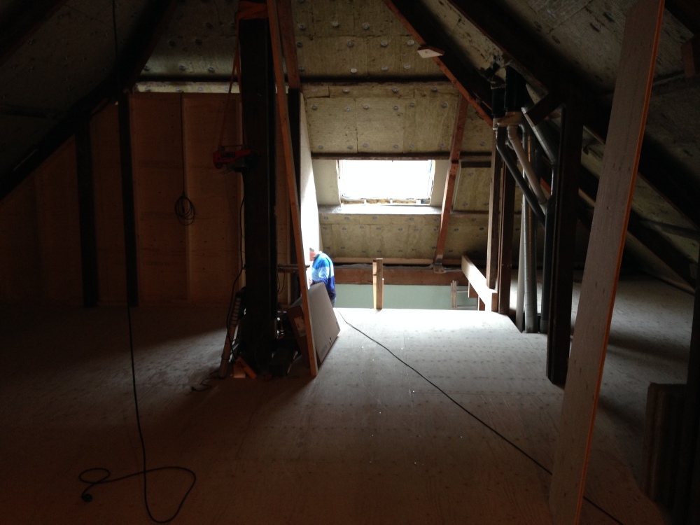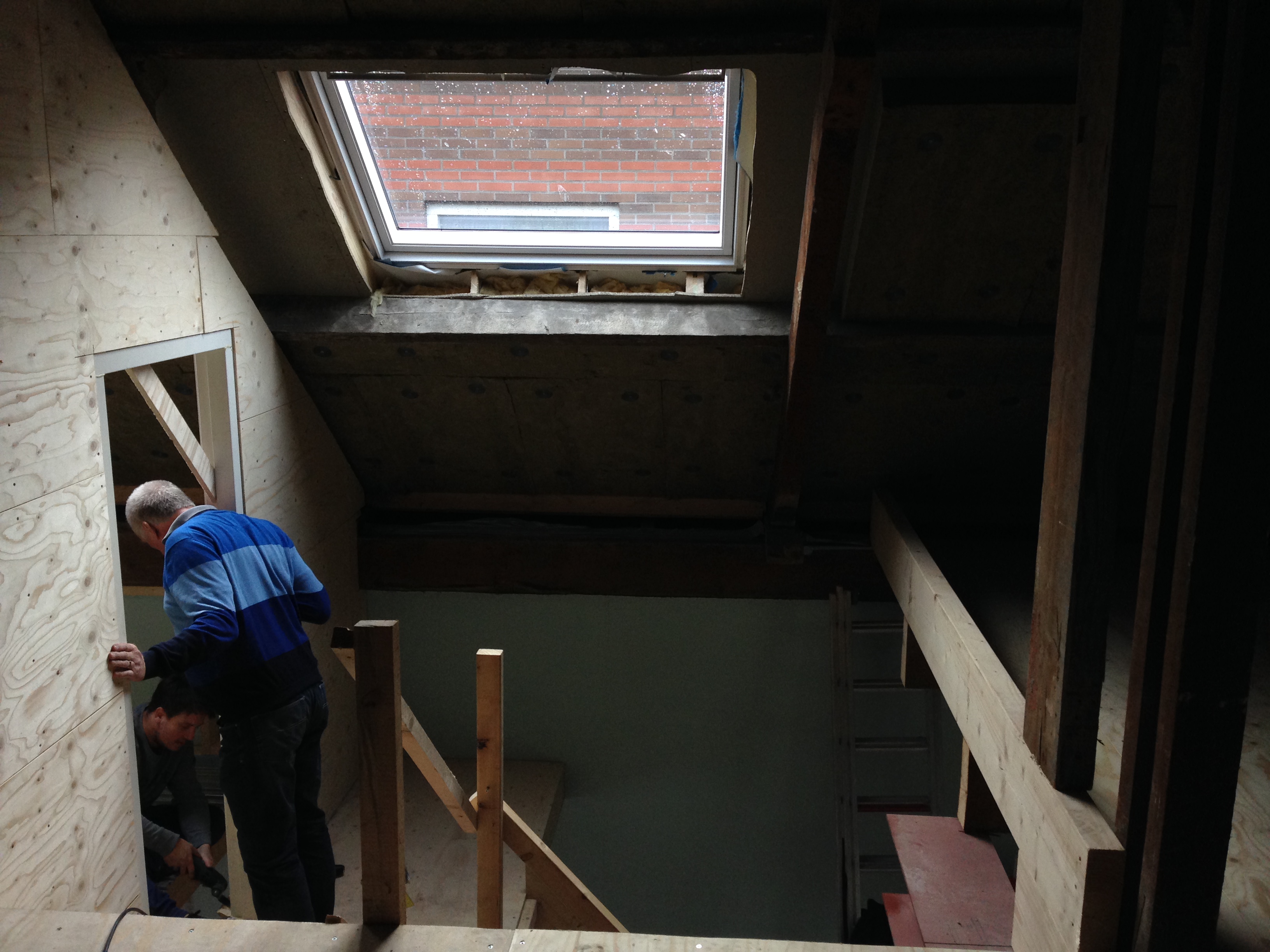 Ze hebben ervoor gekozen hun badkamer een stuk te laten verzakken en vlak onder het schuine dak te plaatsen. Vorige week zijn er twee dakramen geplaatst die prachtig veel licht binnenlaten en de zolder ineens iets bewoonbaars gaven. Het licht is zo fel, of onze zolder is zo donker, dat het zelfs naar ons huis doorstraalt en bijna een beetje hoop geeft dat het er misschien toch allemaal best leuk uit gaat zien..